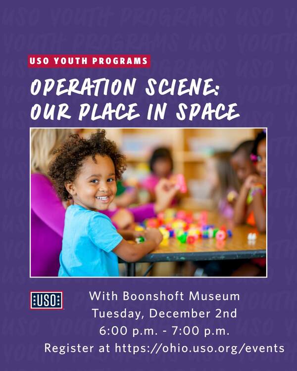 Join the USO and Boonshoft Museum of Discovery for an exciting evening of science, food, and family fun at Operation Science: Our Place In Space! This interactive event invites military families to soar into the world of space through a variety of activities. Before the event begins, families will enjoy a pizza party! Please make sure to only register one parent then note the number of additional parent(s) and the number of children who will be attending as well.