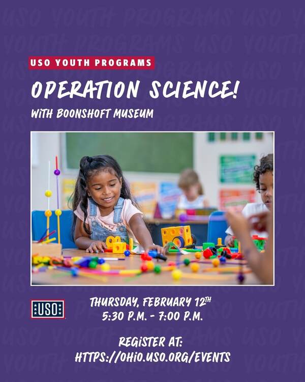 Join the USO and Boonshoft Museum of Discovery for an exciting evening of science, food, and family fun at Operation Science: Motion. This interactive event invites military families to learn about motion and physics through variety of activities. Before the event begins, families will enjoy a pizza party! Please make sure to only register one parent then note the number of additional parent(s) and the number of children who will be attending as well.