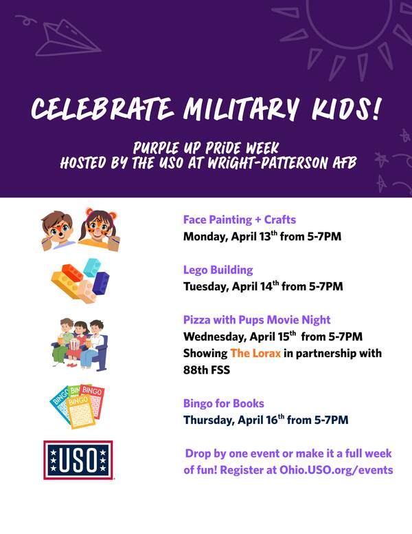 The USO, in partnership with the 88th Force Support Squadron, invites you to enjoy a special showing of The Lorax on the big screen in the Auditorium. Grab a slice of pizza, snuggle up with lovable therapy dogs, and relax!